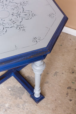 Dieses bezaubernde Set aus Tisch und Stuhl wurde mit viel Liebe und Kreativität neu gestaltet und strahlt nun in einem frischen, modernen Look. Der sechseckige Tisch, dessen dunkle Oberfläche einst seine schönen Schnitzereien verbarg, wurde in einem sanften Grau gestrichen, das die kunstvollen Details wieder zum Vorschein bringt. Die Beine sind ebenfalls in Grau gehalten, während die Seiten in einem kräftigen, dunklen Blau neu lackiert wurden.