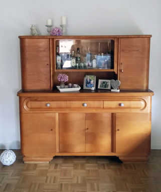 Das 50er Jahre-Buffet besteht aus Ober- und Unterteil und wurde innen und außen komplett erneuert und mit hochwertigem Acryllack gestrichen und mit Klarlack versiegelt. Die sichtbaren Holzelemente wurden mit mehreren Schichten Schellack neu aufgearbeitet, wodurch die Holzmaserung eine tolle Tiefe und einen schönen Glanz bekommt.