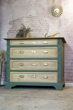 Der Korpus der Kommode ist in einem ansprechenden, gedeckten Grünton gestrichen, der einen eleganten Kontrast zum hellen Holz bildet. Die aufwendigen, geschnitzten Details an den Seiten sind ein echter Blickfang und zeugen von der handwerklichen Qualität.