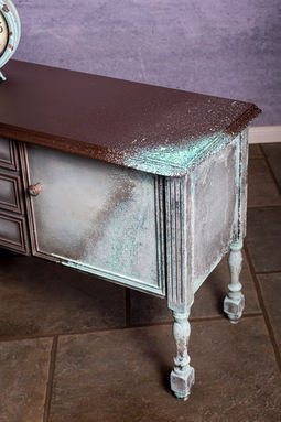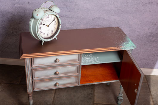 Diese bezaubernde kleine Kommode wurde mit Kreidefarbe in verschiedenen Grau- und Blautönen gestaltet. Die Deckplatte und die Kanten der Kommode wurden in einem wunderbar schimmernden Bronzeton gestrichen.