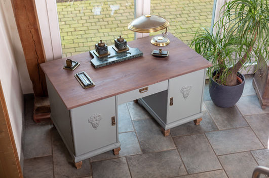 Der Schreibtisch wurde umfassend überarbeitet: Die massive Holzplatte wurde sorgfältig abgeschliffen und mit einer hochwertigen Ölbehandlung veredelt und anschließen gewachst, wodurch die natürliche Maserung des Holzes besonders schön zur Geltung kommt. Der Unterbau erhielt eine neue Lackierung in einem stilvollen Grau mit leicht grünen Untertönen, der perfekt mit den dekorativen Applikationen harmoniert. Ergänzt wird das Gesamtbild durch elegante Messingbeschläge, die dem Schreibtisch den gewissen Hauch von Nostalgie verleihen. Die Holzfüße im Naturton setzen einen schönen Kontrast zur Lackierung und runden den Look harmonisch ab.