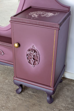 Dieses Möbelstück zeichnet sich durch seine zeitlose, elegante Form mit einem ovalen Spiegel und zwei praktischen Schränken aus. Der aufwendige Ombré-Effekt schafft einen fließenden Übergang verschiedener Pflaumentöne, der dem Möbelstück eine faszinierende Tiefe und einen luxuriösen Charakter verleiht. Der Innenraum erstrahlt in einem fröhlichen Rosé und es wurden kunstvolle Schablonierungen aufgebracht. Zusätzlich wurden die filigranen Verzierungen und Griffe dezent hervorgehoben, was der Kommode ihren einzigartigen Charaktere verleiht. Ob als Schminktisch im Schlafzimmer, als stilvolle Konsole im Flur oder als dekoratives Element in jedem Wohnraum – die Kommode ist vielseitig einsetzbar.