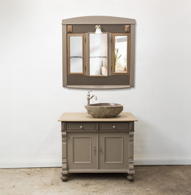Passend dazu thront über dem Waschtisch ein Spiegel, den ich aus einem antiken Kopfteil eines Bettes gefertigt habe. Die warmen Holztöne und die filigranen Details des Rahmens verleihen ihm einen besonderen Vintage-Charakter. Die passende Spiegel-Beleuchtung setzt den Spiegel nicht nur stilvoll in Szene, sondern sorgt auch für angenehmes Licht in Ihrem Badezimmer.